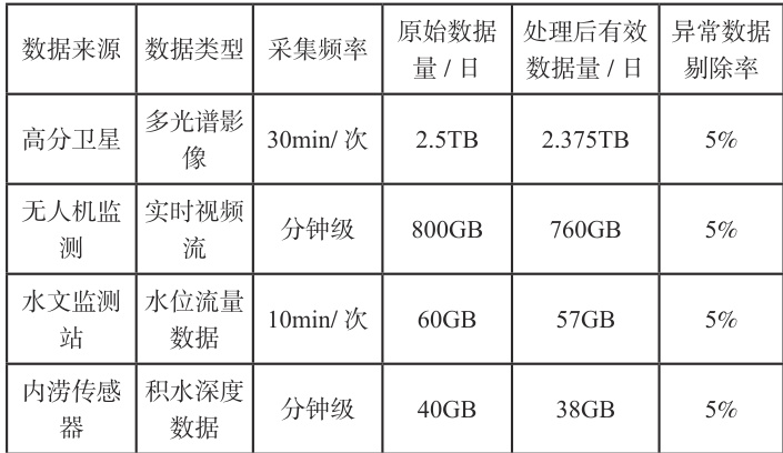 构建“天基 - 空基 - 地基”多维感知网络,集成高分系列卫星、低空无人机监测系统、流域水文监测站及城市内涝传感器数据。具体如表1 所示: