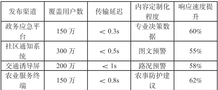 通过表4可知,采用自适应内容生成算法,针对政府应急部门、社区、交通、农业等 8 类用户群体定制差异化预警方案。平台支持800 万级并发访问,预警信息20s 内触达 8 5 % 以上目标受众,公众应急响应速度提升 5 8 % 。