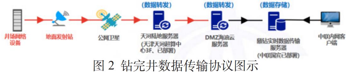 在整个数据传输过程中,凸显路由段间的配置及其作用。具体而言,从井场到公网卫星再到天河陆地服务器这一路由段,需要根据获取的公网 IP 完成井场网络设备间的链接及配置,同时要完成井场至天河的端对端协议配置,确保数据能够准确、高效地从井场传输至天河陆地服务器。当数据到达天河超算中心后,由天河陆地服务器转发至海油 DMZ云服务器的路由段,需要海油 DMZ 云中心协助完成至天河的路由和协议配置,以保障数据在此环节能够顺利地传输。从海油 DMZ 云服务器转发至随钻实时数据传输服务器的路由段,须严格遵循数据传输协议原则,确保数据能够准确无误地被接收、处理和存储,为中联内网客户端提供可靠的数据服务。见下图2 所示: