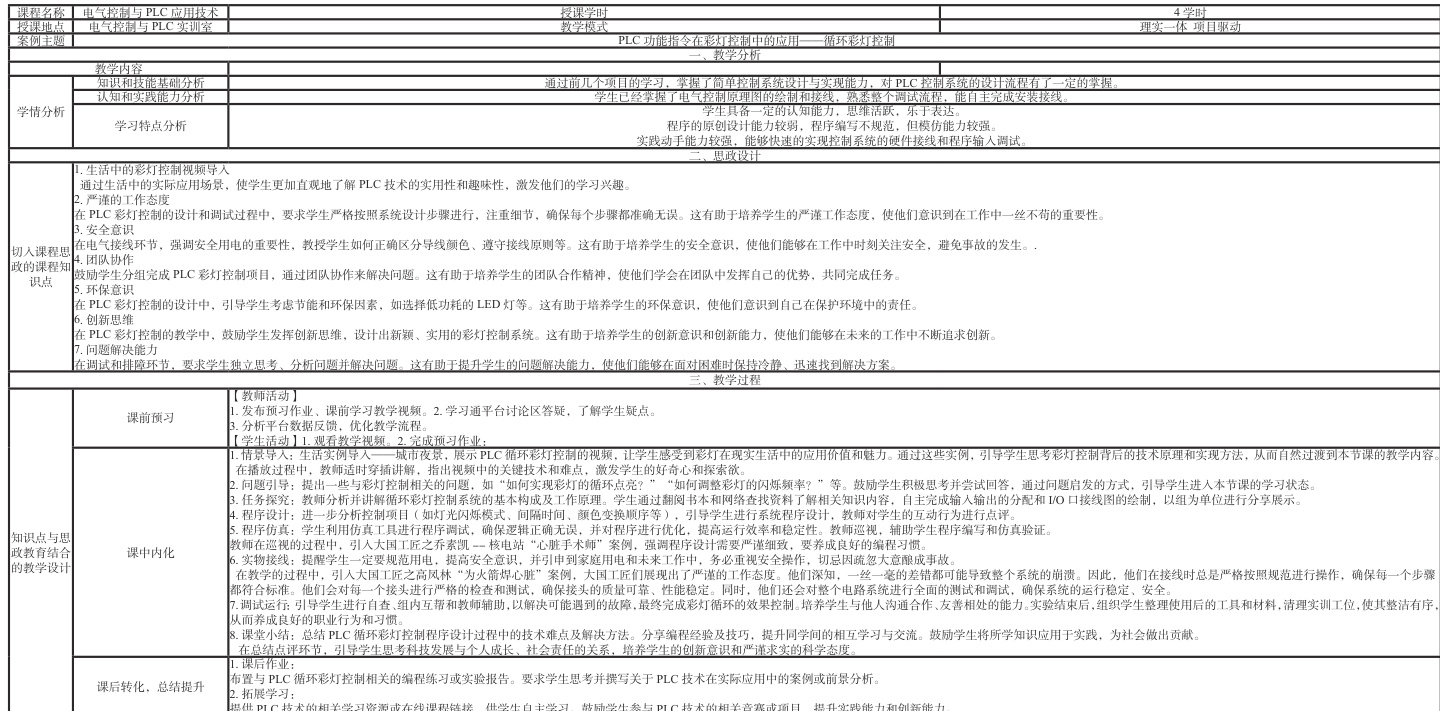 将思政元素自然地融入 PLC 彩灯循环控制的专业教学中,既传授了专业知识,又培养了学生的思想政治素质。通过案例分析、项目实践等方式,将守时、严谨、团队合作等思政要素与 PLC 编程、彩灯循环控制等专业技能紧密结合,实现了知识传授与价值引领的统一。