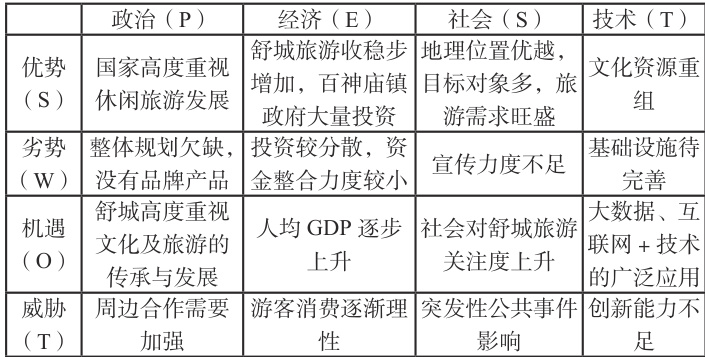 百神庙镇,隶属于安徽省六安市舒城县,地处舒城县东北部,大别山北麓,杭埠河南岸,与合肥市庐江县毗邻。基于多个分析维度建立百神庙镇旅游发展的SWOT-PEST 分析矩阵,如表1 所示。由表1 可知,国家大力支持旅游业发展;投资分散和宣传是阻碍舒城旅游业发展的主要原因;社会对百神庙镇旅游关注度逐渐提升,对推动百神庙镇旅游业高质量发展具有重要意义;大数据和互联网 + 技术的发展与应用为百神庙镇旅游带来良好的发展机遇;缺乏创新能力会影响旅游业发展。因此,需要提出有效的改进方案,促进百神庙镇旅游业高质量发展。