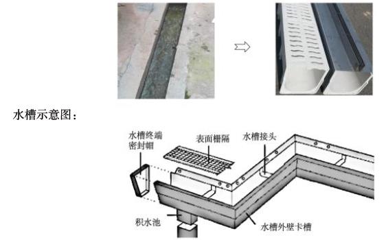 1.更换水沟材质。水沟的尺寸增加1 厘米左右,内部加装塑料水槽,防腐蚀的同时增加了内壁的平滑度。水槽分段布局,每段 1.5-2 米,可抽插清理。水槽采用卯榫无缝对接,避免垃圾渗透和渗漏。