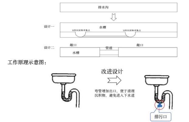 2.改进水槽设计。目前菜场的排水沟基本上是一直连接到垃圾处理站,如果发生堵塞就会发生溢出。我们在扩大了水沟后在水槽底部增加U 形积水汇聚点,然后导流到下一级汇聚点在进入落水管。类似于家里的水斗,在下面增加一个 U 形弯管,在弯管处增加一个出口,可以打开清理。
