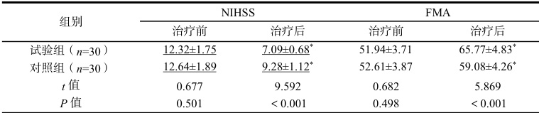 表 1 两组 NIHSS、FMA 评分比较(