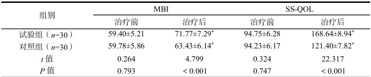 试验组治疗后MBI 评分、SS-QOL 评分高于对照组( P<0.05)c 。见表2。