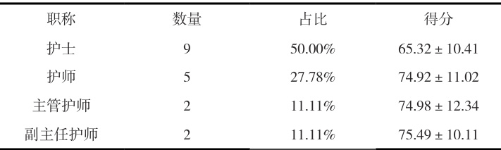 2.1 调查研究人员的数量为18 名,年龄范围在 35.49±2.41 岁,中专人数7 名;大专人员 8 名,本科人数 3 名,护士的数量为 9 名,护师的数量为 5 名;主管护师的数量为2 名,副主任护师为2 名。