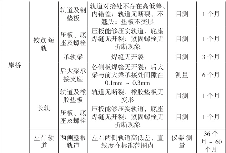 岸桥小车轨道是集装箱作业的主要运动载荷受力部位,故每月应该对其进行检查,根据检查情况定期对小车轨道进行养护,才能保证岸桥小车轨道尤其是铰点短轨的安全稳定运行。具体见表1
