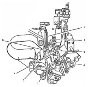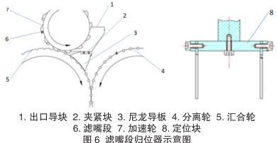 见图 6 所示,在加速轮 7 出口处,加装一个归位器。归位器包括两片尼龙导板 3、一个定位块 8 和两个夹紧块 2。定位块通过螺钉固定于加速轮出口导块 1 上,其中心与鼓轮系中心重合,长度 = 滤嘴段长度 +0.8mm,不同的滤嘴段 6 长度需要更换相应尺寸的定位块;内外两片导板分别通过螺钉、夹紧块固定在定位块的两侧。导板可以在滤嘴段与烟支汇合之前将移位的滤嘴段归中,防止移位的滤嘴段挤落烟支或滤嘴段缺失。