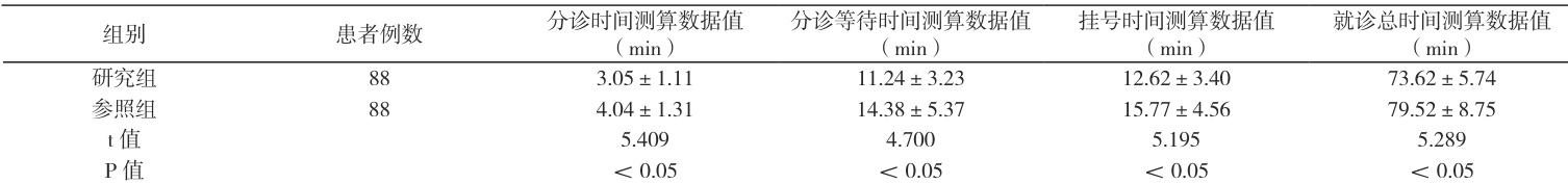 表 2 两组的分诊时间测算数据值、分诊等待时间测算数据值、挂号时间测算数据值以及就诊总时间测算数据值比较( x ± s )