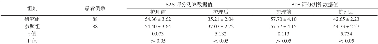 表 3 两组接受护理前后的 SAS 评分测算数据值以及 SDS 评分测算数据值比较( x ± s)