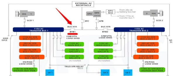 波音 737NG 飞机的 115V 交流转换汇流条(Transfer Bus)是连接主电源(IDG)、辅助电源(APU)及外部电源的关键节点。“TRANSFER BUS OFF”灯亮表明对应转换汇流条及其下游所有汇流条失电,属重大故障现象。尤其在接通APU电源时出现该灯常亮,是常见且蕴含逻辑“陷阱”的故障。本文整合技术原理与排故经验,聚焦此故障进行精要分析。