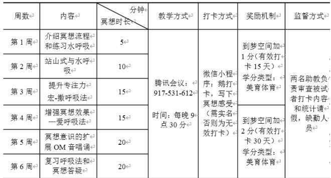 干预方案:为期6 周,每周7 次,每次5-20 分钟不等,包括呼吸训练、意识专注与扩展等冥想形式,通过“鹅打卡”小程序监督打卡。