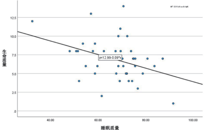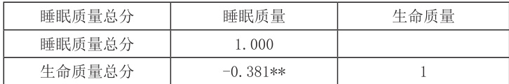 通过 SPSS 软件中的正态分布检验和斯皮尔曼相关系数进行分析得出生命质量与睡眠质量两者呈显著弱负相关( ⋅r=-0.381 , P<0.05 ),即睡眠质量越差,生命质量越低