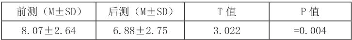 由以上表 2.1 和表 2.2 可知,总分对比:干预前 PSQI 总分 8.07±2.64 ,干预后降至 6. 88±2.75 ,差异显著( 1=3,022 , P=0.004) 。维度分析:主观睡眠质量( P⟨0.001⟩ )、入睡时间( .P=0,011 )维度得分显著降低,日间功能障碍得分下降但未达显著。因此说明 6 周的冥想训练的干预方法对大学生的睡眠质量尤其是主观睡眠和入睡时间方面有明显改善。