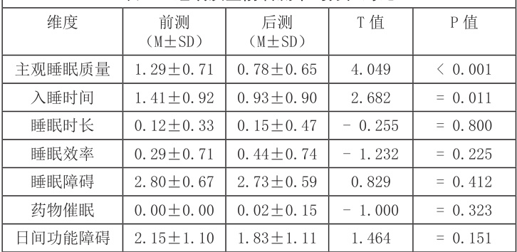 6 周冥想训练干预后,大学生睡眠质量后测得分显著优于前测( :P⟨0.05: )其中主观睡眠质量维度得分低于前测( (P/0.001) ),入睡时间维度得分低于前测( ⋅P<0.05 )。因此冥想可有效改善大学生睡眠质量。