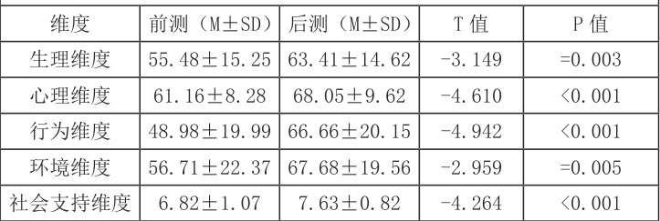 6 周冥想训练干预后,大学生生命质量后测得分显著高于前测( (P⟨0.01) ),生理、心理、行为、社会支持 4 个维度得分均提升(均