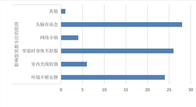 由图2.2 可知在此次实验中,冥想过程中有 68.2% 名被试者反映冥想时出现的杂念干扰了其思维,导致注意力难以集中。63.4% 名被试者因长时间保持固定坐姿,出现不同程度的身体不适感。这种身体上的不适分散被试者的注意力,从而对被试者的冥想状态产生了负面影响。有 58.54% 的被试者表示环境嘈杂干扰其专注力,另外有 14.63% 的人认为室内的强光线影响了他们的冥想效果,而 9.76% 的被试者则指出网络的不稳定打断了他们的冥想进程。这些数据表明,冥想中的杂念,长时间固定坐姿,以及环境因素在很大程度上影响着人们在冥想时的专注力。