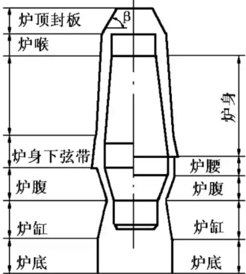 在现代钢铁工业中,大型高炉作为核心的冶炼设备,其安全性和生产效率对整个钢铁业有着非常重要的影响,具体结构如图1。但是炉缸侧壁的高温问题却是 个不容忽视的问题,这种高温不仅会加剧耐火材料的侵蚀,增加烧穿的风险还会降低冷却系统的效率,影响高炉的正常运行,从而严重影响钢铁产品的质量和生产过程的安全。