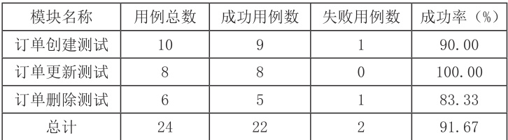 从表 1 的单元测试数据来看,订单创建与订单删除模块各有 1 个用例未通过,其成功率分别是 90% 和83.33%。而订单更新模块的所有用例均顺利通过,成功率达到 100%。整体而言,24 个测试用例中共有 22 个成功执行,平均成功率为91.67%。这反映出系统大部分功能模块能够按预期运行。不过,针对未通过的少量用例,后续还需深入分析原因并加以修复,以增强系统的稳定性与可靠性。