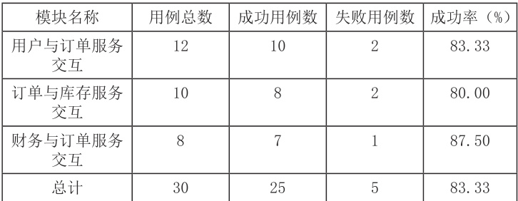 从表2 的集成测试数据来看,用户与订单服务交互模块有2 个用例未通过,成功率为83.33% ;订单与库存服务交互模块有 2 个用例未通过,成功率为 80.00% ;财务与订单服务交互模块有 1 个用例未通过,成功率为87.50%。整体而言,30 个集成测试用例中共有 25 个成功执行,平均成功率为 83.33%。这反映出系统大部分模块间的交互能够正常运作。不过,针对未通过的用例,后续还需深入探究问题根源并加以修复,以保障系统各模块间接口及数据流的完整性和可靠性。