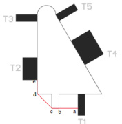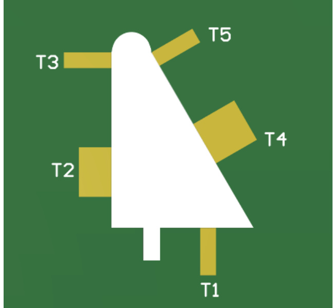 T1 与 T2 之间的爬电距离测量方面,重点要考虑沟槽的影响。经过测量该沟槽宽度超过 1mm,在污染等级 2 的情况下属于宽沟槽,无法直接跨越沟槽进行爬电距离测量。综合考虑需从 T1 连接最短距离至沟槽下方绝缘部位,在通过绝缘板的最短距离连接至 T2。爬电距离路径如图4 所示,测量线段ab 长度+ 线段bc 长度+ 线段cd 长度+ 线段de 长度即为最终测量的爬电距离数值。
