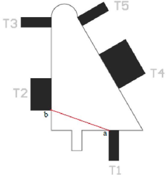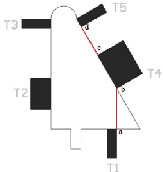 T1 与T5 之间的电气间隙需要考虑到中间跨过的T4 导体部分,实际电气间隙路径可考虑两种方案,第一种为直接从T1 到T5 的直线距离,第二种为 T1 到 T4 部分的电气间隙加上 T4 到 T5 的电气间隙。结合标准中电气间隙为空间最短距离的概念,通过测量确定第二种方式的测量值更小,确定为电气间隙路径。电气间隙测试路径如图3 所示,测量线段ab 长度+ 线段cd 长度即为最终测量的电气间隙数值。