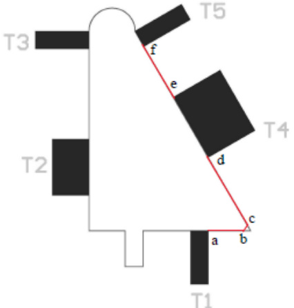 T1 与T2 之间的爬电距离测量方面,重点要考虑两个因素,一是夹角部分的V 型沟槽的影响,二是T4 金属带的影响。其中金属带部分按照GB 4943.1-2022 附录中图O.4 的内容,不计入爬电距离数值;而V 型沟槽部分,经过测量该夹角小于80°,需按照GB 4943.1-2022附录中图O.4 的内容进行跨越连接。爬电距离路径如图5 所示,测量线段ab 长度+ 线段bc 长度+ 线段cd 长度+ 线段ef 即为最终测量的爬电距离数值,其中bc 段按照标准的要求取值为1mm。