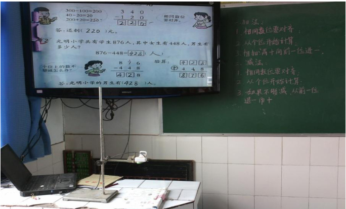 另外 ,在作业本上的书写,解题格式,都可以用摄像头把教师做的展现在大屏幕上,学生就容易按照教师的要求认真规范的书写,比如三位数的竖式计算等。 再如,交流展示学生的作业,等等。