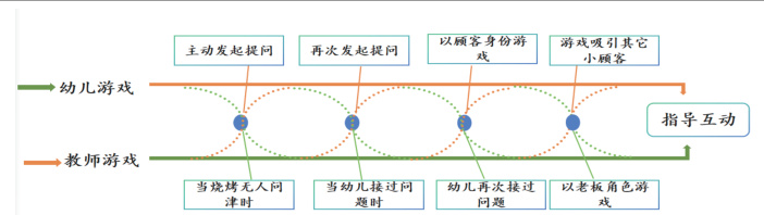 幼儿以老板身份游戏“老板给我递了一串”。最后游戏吸引了其他顾客。教师先是提出有关的问题互动,促使幼儿去思考。再扮演顾客的角色,通过角色与角色之间的互动,起到指导幼儿游戏的作用。在游戏中,幼儿处于主动地位时,教师则扮演配角,根据幼儿的游戏行为做出反应。