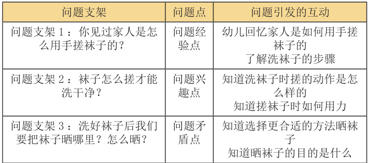 以上案例和分析可以看出:以问题为支架,对幼儿洗袜子这一游戏进行精准互动,在互动中从经验—兴趣—矛盾一步步深入,共同探究同一问题,进行思维碰撞,鼓励幼儿联动自己已有的生活经验进行游戏,促进共性经验发展。
