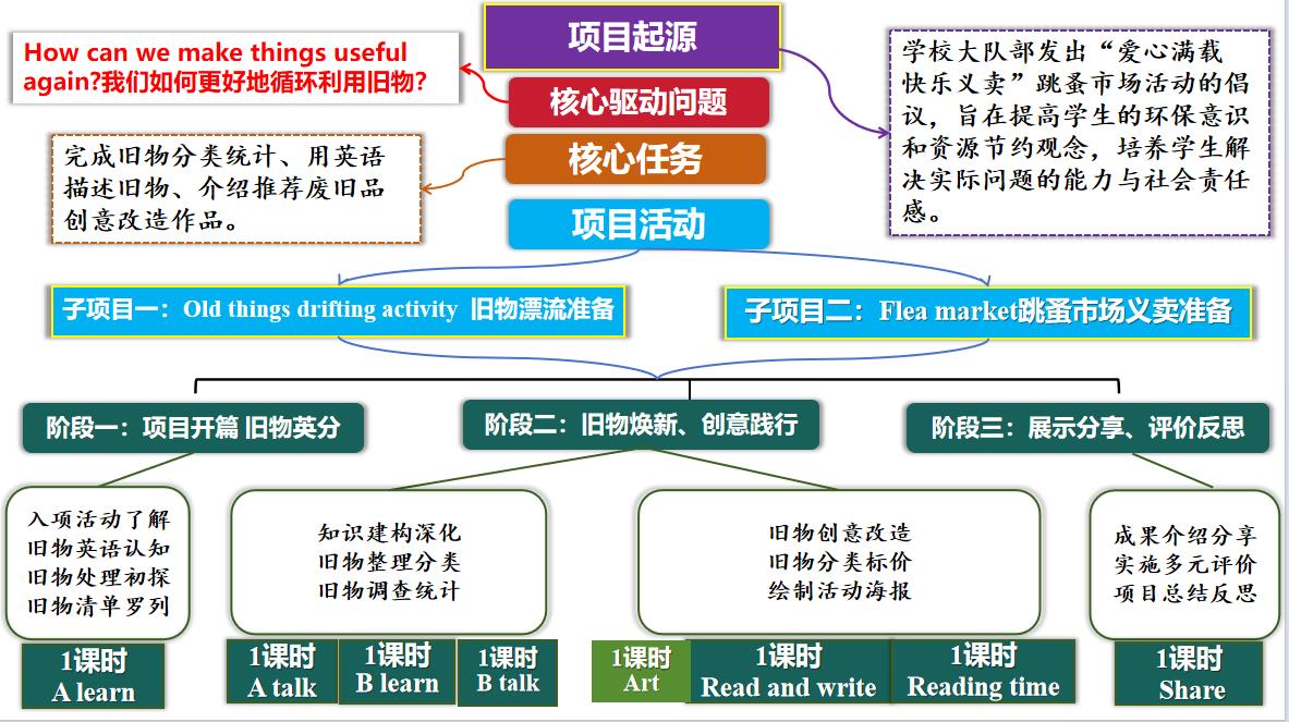 教师围绕“循环利用旧物”主题,将英语词汇与数学、美术、道法等相融合,通过旧物漂流和义卖活动表达的需求,构成这个项目与单元的词汇网络表,以活动激发学生学习兴趣,加深词汇理解及记忆,拓宽学科视野。