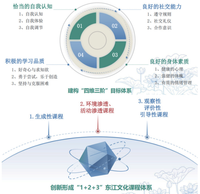 针对小、中、大班幼儿不同年龄段发展特点,创新提出四维三阶目标体系,从自我认知、社交能力、学习品质、身体素质四个维度进行目标创设。