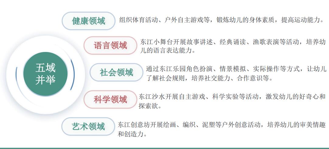 从健康、语言、社会、科学、艺术五大领域出发,强调幼儿园教育全领域育人目标,旨在培养幼儿德、智、体、美、劳各方面的能力,以适应社会发展需求。