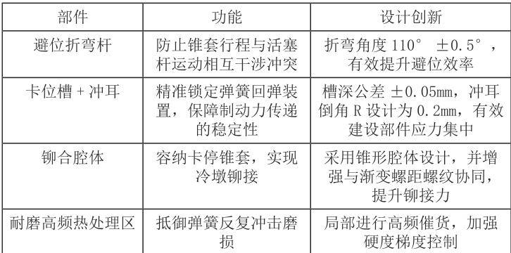 通过上文叙述可知,传统的活塞杆具有结构复杂、关键部位容易磨损、装配精度不足等问题。因此在本项目中,冷镦成型铆接组件活塞杆结构设计采用了结构一体化 + 受力优化 + 耐磨强化设计思路。其中结构一体化部件设计如表2 所示。