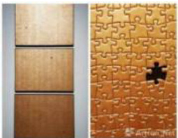 半特异法则是指画面中图案形态的突变,即在统一或近似的形象中出现另类的形态,造成巨大的反差效果,以打破传统的节奏和统一的规律。其具体可分为形状、大小、色彩等特异形式,其本质都是通过局部的变化形成个体与集体的差异,以实现别具一格且生动的视觉艺术效果。在当代艺术创作中,这种特异法则常用于塑造强有力的视觉冲击效果,更突出主体。方志勇的《丝绸之路》(图 5)在数个重复的橙黄色拼图中出现了黑色空洞,这种特异法则的运用在吸引观者的眼球的同时还可以使人产生无限的遐想。