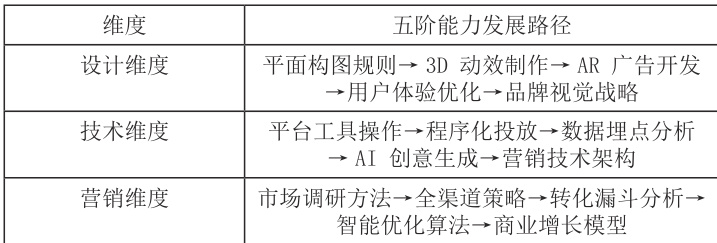 基于对数字广告企业岗位需求的深度调研,提炼出设计、技术、营销三大能力维度,构建 " 五阶递进" 的能力发展路径: