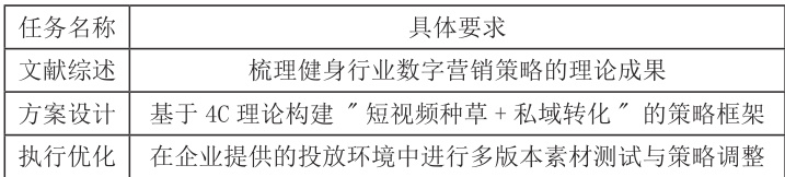 采用 " 企业问题识别 - 教学转化设计 - 学生方案构思 - 企业效果验证 -教学反思优化 " 的闭环模式。以某连锁健身房拓客项目为例,企业提出真实需求后,学生需完成以下内容。