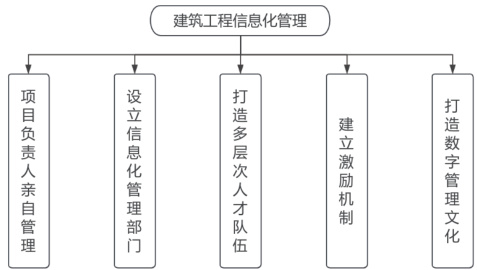 在目前看来,信息化建设虽然对于建筑工程管理优势显著,但除开技术保障以外,“人”仍然是在其中起到决定性作用的。所以,要让信息化真正落地,就必须有强有力的组织保障,这其中涉及到多个层次的管理要求,如图1 所示。