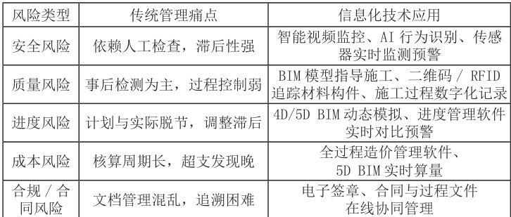 信息技术能收集、整合建筑工程管理流程里的大量数据,借由数据分析技术挖掘数据价值,给风险管控予以有力支撑。其中,在施工安全管理方面,可借助物联网传感器实时采集,覆盖施工场地人员位置、设备运行状况、环境参数(像温湿度、粉尘浓度)等数据,一旦相关数据超过安全阈值之时,系统会自动报警且推送预警消息,提醒管理人员第一时间采取措施,防止安全事故发生[3]。在质量管控方面,经过施工进程中的质量检测数据,可以开展全方位的分析与研判,及早识别其中的质量隐患,如混凝土强度数据异常、施工工艺问题等,从而给项目决策供应科学凭据,降低项目风险。