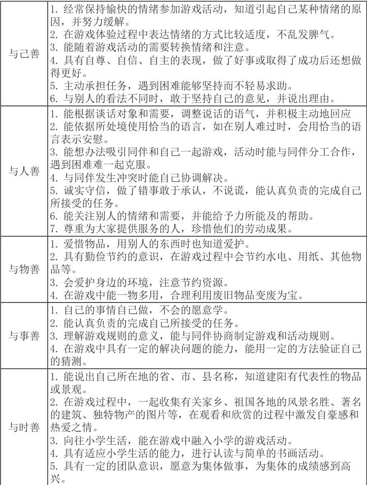 幼儿善美品德融于游戏活动的各个环节,每一次的参与都是幼儿品德的展现,在游戏过程中,他们能够从自己的体验出发,对自身的行为表现、与人态度、情绪情感等各方面进行评价,因此,我们要依据评价指标,从多方面立体地提升幼儿与己善、与人善、与物善、与事善、与时善的“五善”行为及环境美、人仁美、活动美的“三美”社区游戏课程。在此评估的基础上,引导幼儿良好品德的形成。