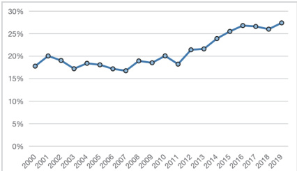 二次能源是经由原煤、原油等一次能源转化得到的,包含电力、煤气、氢能等能源。《2020 中国能源统计年鉴》显示电热行业消耗能源量多,2019 年电热行业能源消费总量为 3.18 亿吨标准煤,单行业能源消耗占能源消耗总量的 6.51%。并且其余行业对电热行业具有较大依赖程度,电热行业产出的同质产品电能可广泛应用于电动汽车等交通领域(郭炳庆等,2018 ;王明飞 2009)、居民生活(方黎明和陆楠,2019)等行业,具有绿色健康、可持续、低成本的特点。近年来,新能源发电量占总发电量比重逐年攀升,2019 年发电占比达27.4%(图1),但是新能源的使用仍有大幅增长空间,尤其是能源结构电力行业的成本有效和零成本技术都具有较大减排潜力(刘楠峰等,2017)。发展可再生能源、蒸汽、核电等技术,实现新旧动能转换,替代石油等传统能源,从而优化二次能源消费结构,如化工行业应用的“煤气化多联产燃气轮机发电技术”将甲醇生产过程中排放的弛放气中的氢气转化为燃气轮机发电燃料,这一应用提高了氢气能源使用占比。基于电、氢等能源替代,结合化石能源清洁高效利用与耦合替代,实现可再生能源多能互补与规模应用,实现能源结构低碳化转变。以新型发电系统的技术体系为支撑,拓展技术实现和工艺再造方法,构建技术的可能路线图,为能源结构优化提供方向性指导。