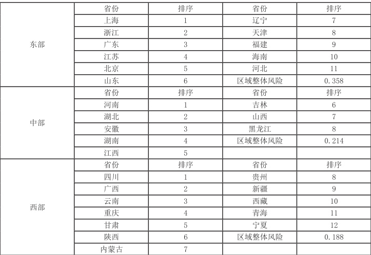 进一步将样本分为东中西三大区域,从横向维度对三大区域的金融风险进行对比分析,并依据各省金融风险水平的高低在区域内进行排序,对区域内各省市的金融风险差异进行分析。