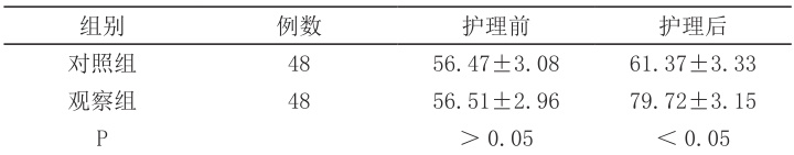 由表 3 可知,护理前,两组患者生活质量评分无明显差距,护理后,对照组患者生活质量评分为 61.37±3.33 ,观察组患者生活质量评分为79.72±3.15,观察组评分更高( :P<0.05: ),差异具有统计学意义,表明护理效果更好。