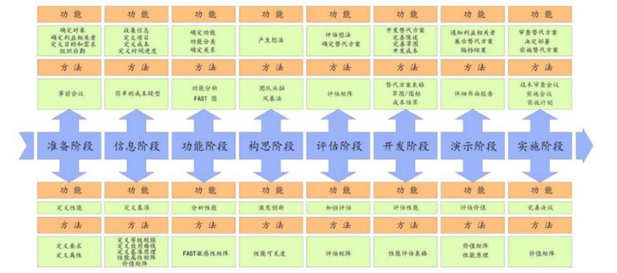 价值工程的工作流程经历了发展完善,从迈尔斯最初提出的信息、分析、创新、评估、发展五个阶段,演变为通用的八个阶段:准备、信息、功能、构思、评估、开发、演示、实施。该流程具有迭代性,任一阶段可返回此前步骤重新评估或修改,且各阶段存在重叠,部分活动可并发进行,为团队系统识别与实现价值提升提供更多机会。