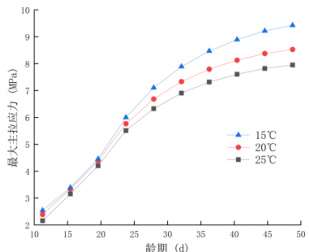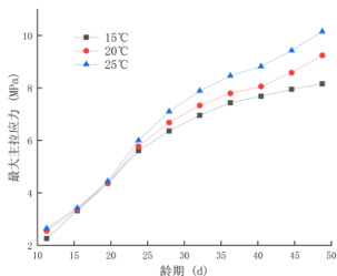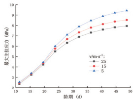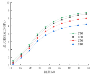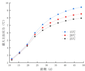 由图可知,分别用四种材料浇筑 度极值曲线走势基本一致,由于材料不同,传导率与比热也不同,使得 C40 混凝土浇筑的 降较快,C50 混凝土次之。与不同风速下温度极值时程曲线相比,材料对于大体积混凝土水 风速。 图 17 表明,材料强度越高,产生的最大主拉应力越大;随着材料强度的降低,最大主拉应力的增长幅度也逐渐减小,并逐渐趋于稳定。