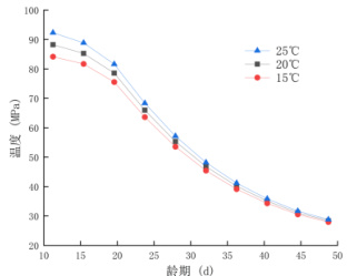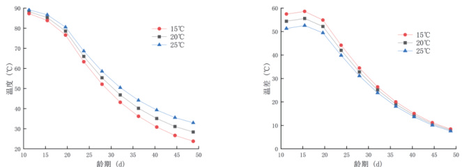 2.1.4 不同浇筑温度下温度场与应力场分析混凝土浇筑时的温度对其温度场与应力场也有一定的影响。本文选取三种典型浇筑温度 15,20,25℃对大体积混凝土进行分析。