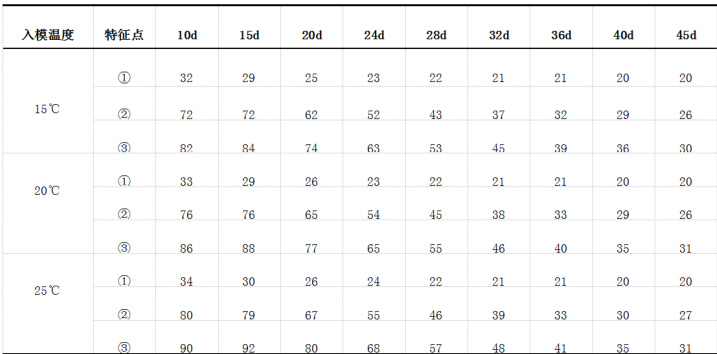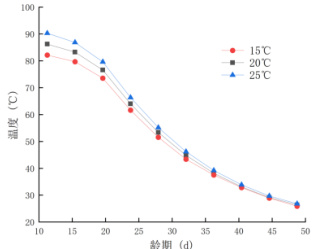 由图可知,温度极值随入模温度的升高而增加。同时与图 5 相比,在不同入模温度作用下,大体积混凝土在短龄期内的温度极值相差较大,最终趋于平缓且温度相近。
