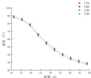 混凝土的种类不同,其时变特性也有一定的区别,时变特性的改变会导致混凝土温度场与应力场的变化。下文取风速 15m/s,环境温度 20℃,入模温度 20℃,分别选取 C40、C50、C60 和 C70 混凝土浇筑下横梁并对其进行水化热分析。