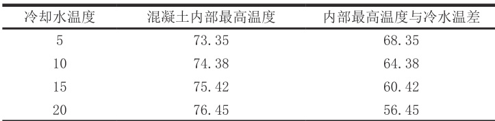 一般来说,冷却水的温度越低,冷水管与混凝土之间的热交换越大,大体积混凝土温度的降低越明显,但冷却水与混凝土之间的温差较大会导致温度应力的增大从而增加混凝土开裂的可能性。故采用冷却水温度分别为 5、10、15、20℃工况下利用有限元软件进行模拟分析,计算结果见表2。