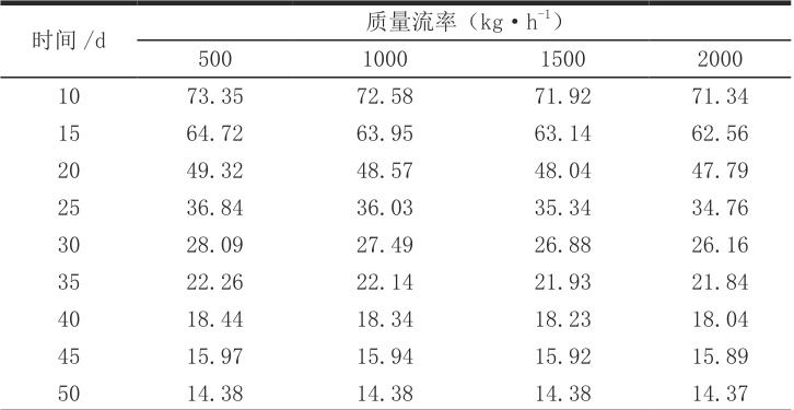 由表 3 可知,随着质量流率以 500kg/h 的速度增加,降温速率并未发生明显变化,且在 1500kg/h 之后,质量流率的增加只降低了混凝土内部最高温度,却并没有加快混凝土内部的降温速度。综合降温效果及成本,选择质量流率为 1500kg/h最为合适。